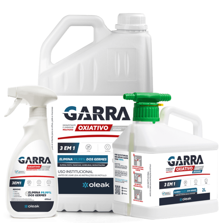 Garra Oxiativo é um poderoso desinfetante e limpador geral multiuso, que limpa, desinfeta e alveja em uma única operação. Contém, em sua composição, uma combinação de peróxido de hidrogênio e de tensoativos tecnológicos que resultam em praticidade e eficiência. Reage com a matéria orgânica formando pequenas bolhas efervescentes que auxiliam na remoção da sujeira. Isso reduz a necessidade de ação mecânica abrasiva no processo de limpeza. Disponível nas versões 5 litros, Pronto Uso (490mL), SAD 4G Original (2L) e SAD 4G Inodoro (2L).